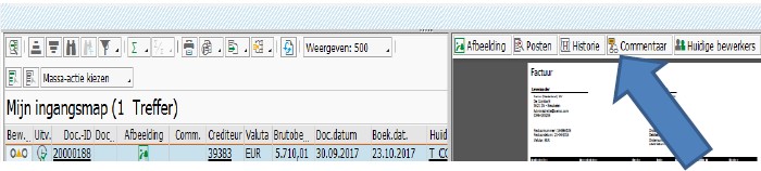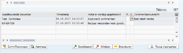boekingsregels, hier is het WBS element en grootboek te zien - Historie = hier kan je de historie zien van de betreffende factuur (wie heeft wat