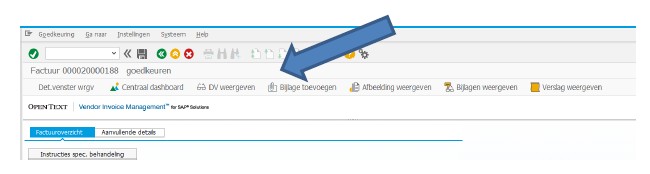 Bovenin het scherm zie je welke taak het betreft, in dit geval het goedkeuren van een factuur. Je ziet 3 knoppen (blauwe pijltjes):