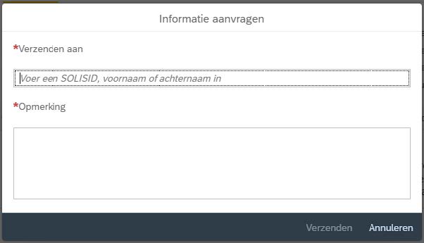 Informatie aanvragen: Hiermee dien je een informatieverzoek in, je kunt dit gebruiken om een vraag te stellen over de goed te keuren factuur, bijvoorbeeld of het WBS klopt. Wanneer je op deze knop klikt verschijnt het volgende scherm: